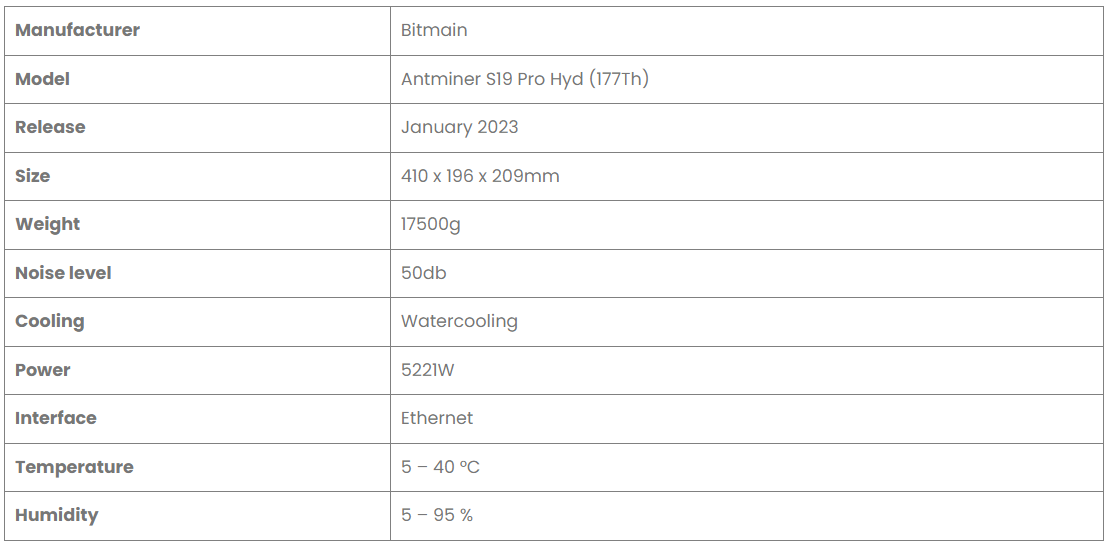 Bitmain Antminer S19 Pro Hyd is a miner that uses the SHA-256 algorithm with a mining power of 177Th per second with a consumption of 5221 watts.Specifications