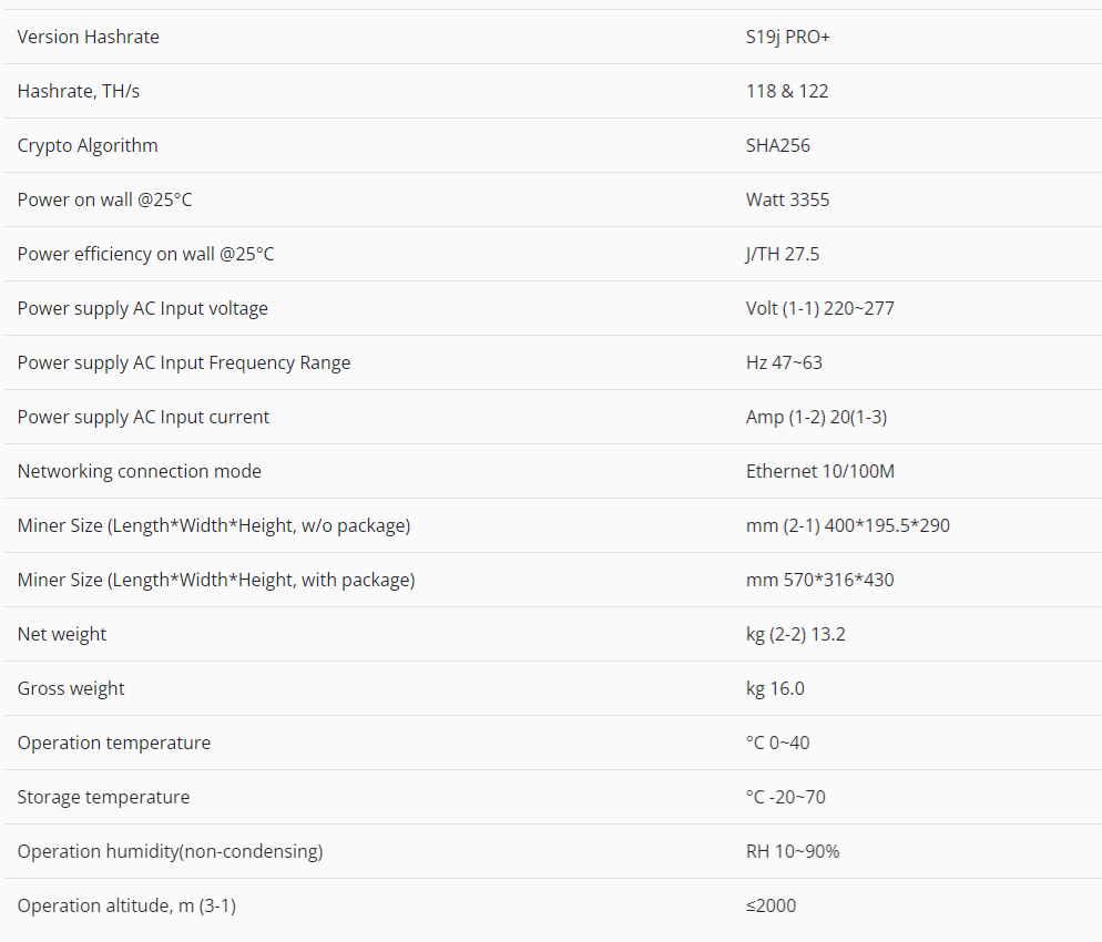 Model Antminer S19j Pro+ (122Th) from Bitmain mining SHA-256 algorithm with a maximum hashrate of 122Th/s for a power consumption of 3355W.